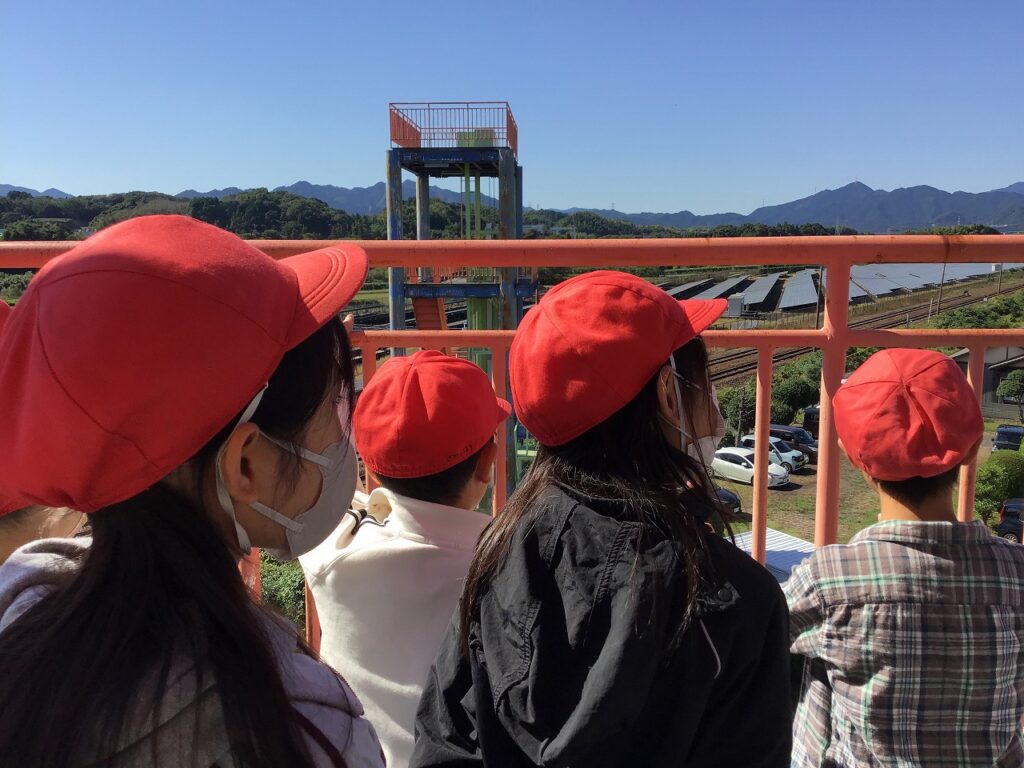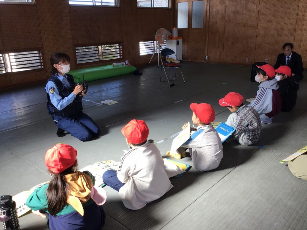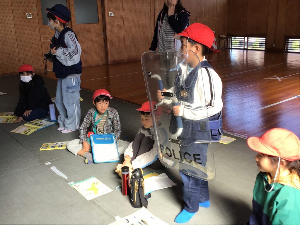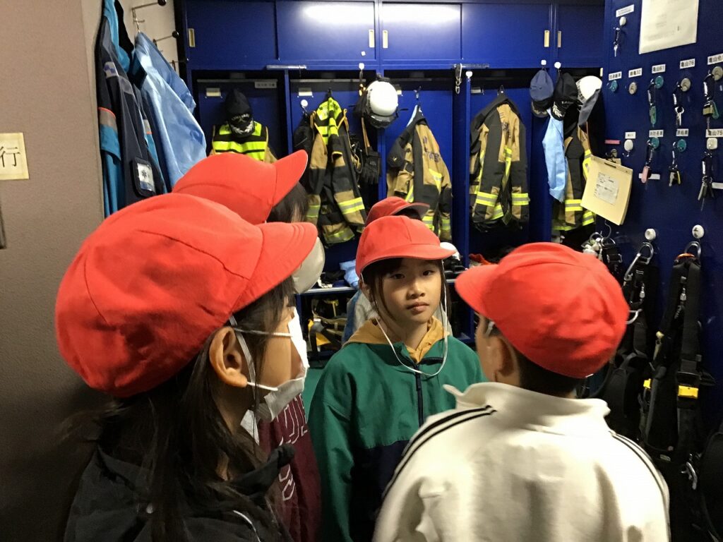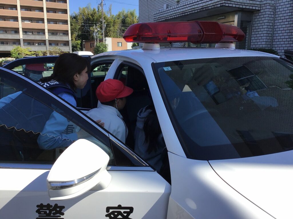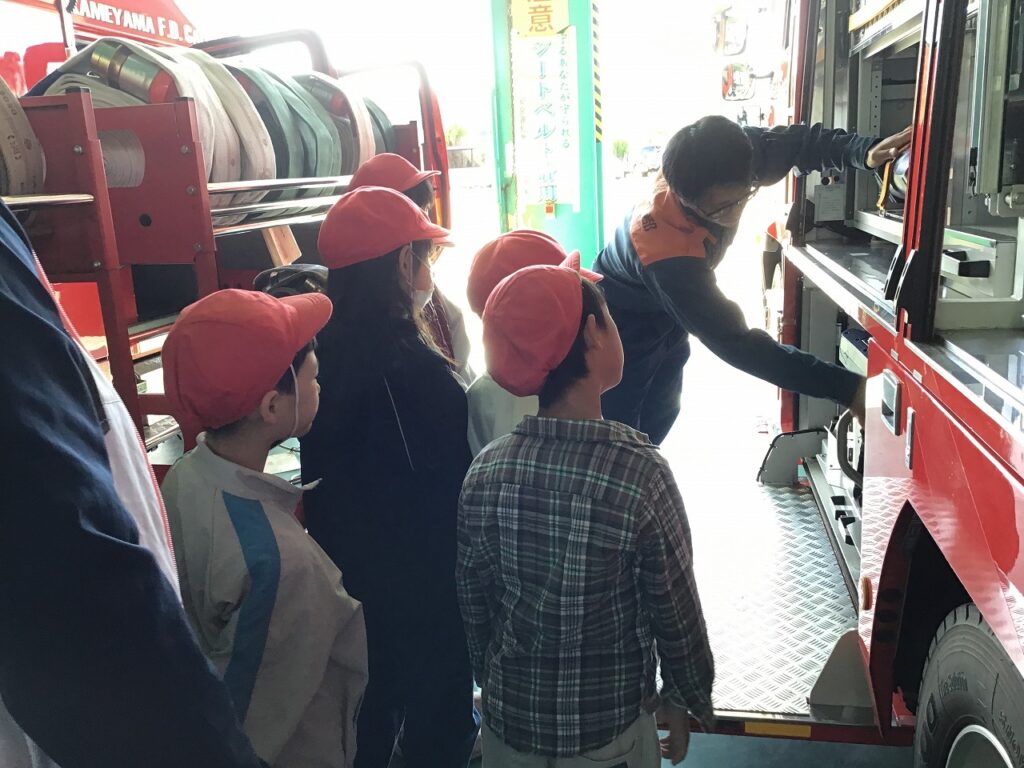 今日、3年生が亀山警察署と亀山消防署に社会見学に行きました。警察署では、警察官の持ち物を紹介してもらった後、全員がその持ち物を身につけさせてもらいました。また、署内を見学した後には、白バイやパトカーに乗せてもらいました。消防署では、仮眠室や食堂、お風呂、通信指令室などを見学した後、救急車や消防車の装備品などについて教えてもらいました。子どもたちが一番気になっていたのが訓練塔です。お願いすると、訓練塔にも上らせてもらうことができ、消防士さんたちが日頃から体を鍛え、訓練をしている様子がよくわかりました。「一番うれしいことは何ですか」の質問に、警察官の方も消防署の方も「『ありがとう』と感謝の気持ちを伝えられたときが一番嬉しいです」と話され、子どもたちは、「なるほど」と大きくうなずいていました。少人数のため、一人一人が説明を間近で聞くことができ、一つずつ詳しく教えてもらったり、様々な体験をさせていただいたりすることができました。