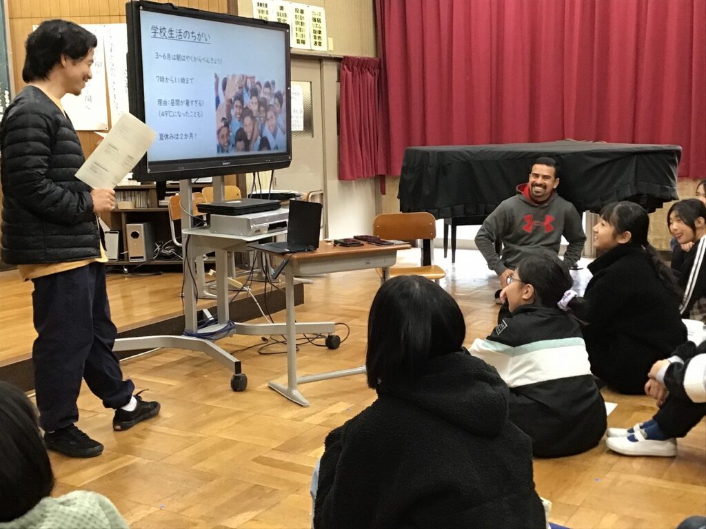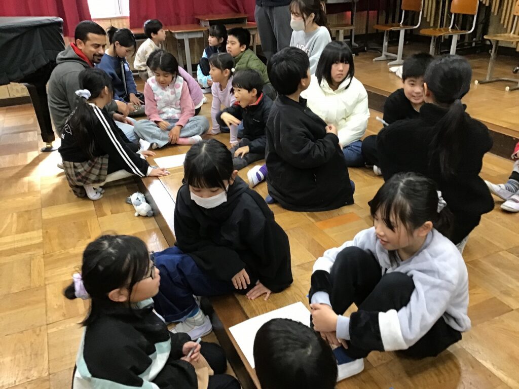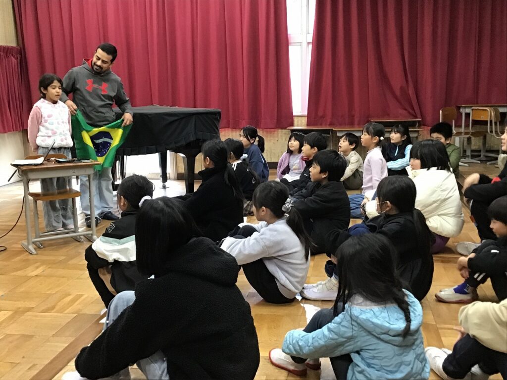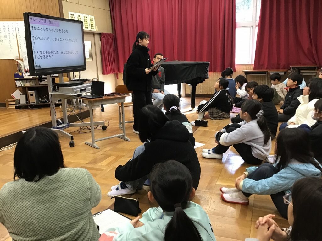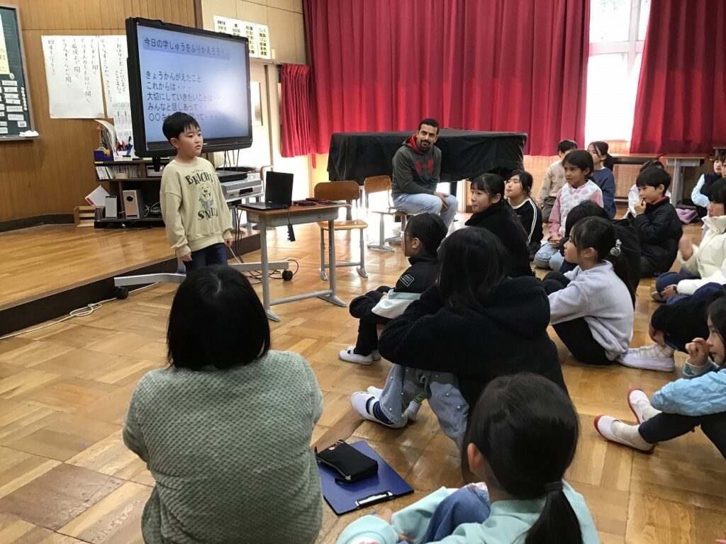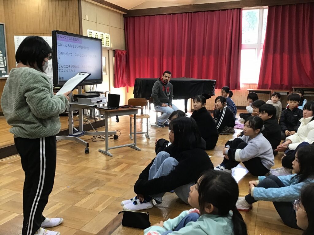 先日、全校児童が集まって人権集会を行いました。テーマは、「ちがいを知り、ちがいを楽しみ、みんなが安心して過ごせる学校を考えよう」です。最初に保護者や先生からブラジルとインドの挨拶や食事、学校の様子などの話を聞きました。子どもたちは、それぞれの国には文化があり、それぞれの国の人がその文化を大切にしていることや、国によって文化は違うことを知りました。その後、その他の違いにも目を向け、違いがあることで困ることやそのための工夫についてグループで話し合いました。子どもたちは、「人によって思っていることや考え方、性格が違う」「すきなものや得意なものが違う」などと自分たちの日常を振り返って「違いは当たり前。それを認めることが大切」「自分の思いを相手に伝えることや相手の理由や気持ちを聞くことが大切」「相手のことを考え表情もよく見ることが大切」「それぞれが自分の思いを出せるように意見を出しやすい環境をつくることが大切」などと、意見を出し合いました。そして、最後にれから自分が大切にしていきたいことを宣言文にまとめました。