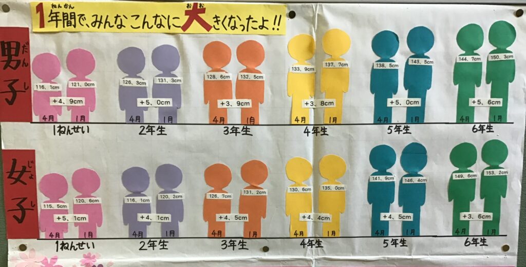 保健室の前や廊下には、養護教諭が健康に係ることで知ってほしいことや気を付けてほしいことを掲示しています。今回は、「姿勢を正しくしよう」です。寒い時期ですので、ついつい背中が丸まってしまいがちです。そこで、姿勢正しくすると、脳のはたらきが良くなったり、集中力がアップしたりする等の効果があることを、子どもたちが興味をもてるように、そして分かりやすいように示しています。