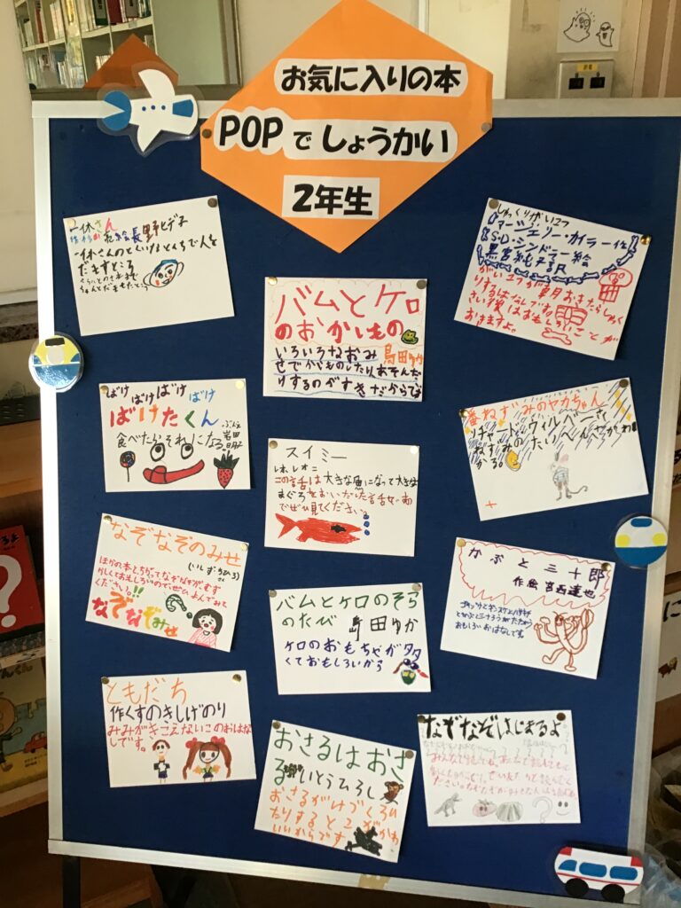 2年生が、1年生と先生たちをおもちゃランドに招待してくれました。遊びに来てくれた人に楽しんでもらえるようなおもちゃを作りました。また遊び方を画用紙に書いて掲示をしたり、分かりやすく説明したりできました。貰ってうれしいメダル等の賞品も大好評でした。2年生は、1年生や先生たちが楽しんでくれたことに、喜びとやりがいを感じていました。