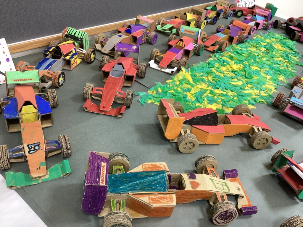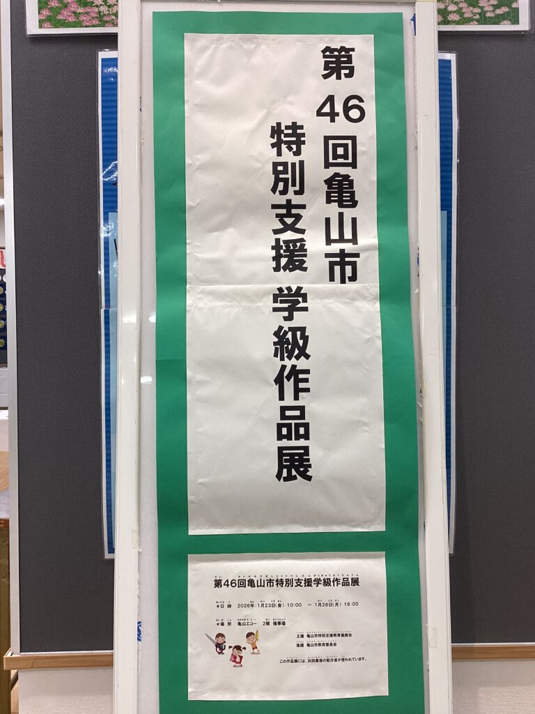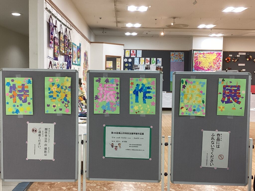 まずは、2Fで作品展を見学です。自校の作品、他校の作品それぞれを鑑賞しました。どの学校の展示も、個性が発揮され、味わいのある作品が並んでいました。亀山東小学校は、手形を使った花火の作品、段ボールクラフトによるF1カーショー、さつまいもリースを展示していて、鮮やかな作品展となりました。「特教振作品展」の看板となっているコラージュも、高学年児童による作品です。