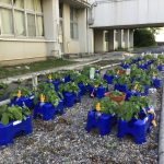 1.2年生が植えた植物が、すくすく生長しています。1年生が植えたゴーヤは、巻きひげを伸ばしてネットを上へ上へとのぼっていっています。また、朝顔もついこの間、芽が出て双葉が開いたと思ったら、本葉が開き、つるも伸び、そろそろ支柱が必要になってきました。2年生の夏野菜もずいぶん大きくなりました。子どもたちも、毎朝、水やりをしながら植物の生長を喜んでいます。