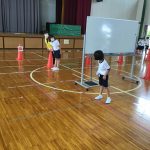 また、見通しの悪い交差点では、「亀の首にみたいに首をしっかり回して、右よし、左よし、右よしって、確認するよ。」と教えていていただきました。お話の後は、実践です。体育館内につくった道路を一人ひとりが安全確認しながら歩きました。