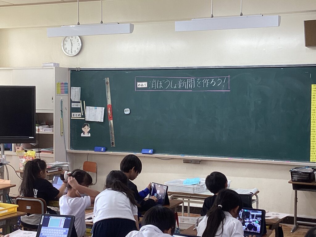 3年生の授業では、15日(水)の社会見学(亀山消防本部、亀山警察署)での体験をもとに、新聞づくりが進められていました。