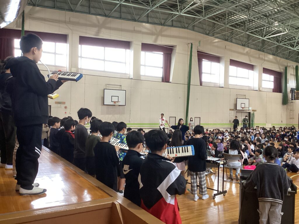 5年生の発表は、『アンパンマンのマーチ』の演奏でした。明日の「小中学校音楽会」のプレ発表という形で、今までの練習の成果がよくあらわれていました。