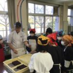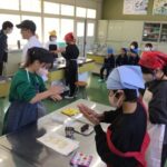 11月28日、3・4限目に、地域の老舗和菓子屋「生甘堂」の伊藤さんを講師に招き、5年生が稲作体験学習で収穫したもち米を使った「おはぎづくり」を体験しました。初めに、あんでもち米を包むときのこつを実演しながら教えていただき、その後、実際にこしあんと粒あんのおはぎをつくることに挑戦しました。子どもたちは四苦八苦している様子でしたが、楽しみながら作業をしていました。この日の給食には、生甘堂さんに昼生米でつくっていただいたおはぎと赤飯が全校児童に配られ、皆で味わいました。ごちそうさまでした。