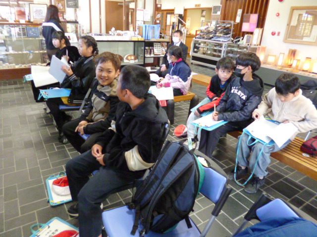 1月17日(金)、4年生が社会見学に出かけました。社会科で学習する「私たちの住んでいる県」に関して、「伝統的な産業」と「漁業」について、身近な地域から学ぶことにしました。まず、鈴鹿市の「鈴鹿伝統産業会館」を訪問し、着物の柄を染める型となる「伊勢型紙」と昔から字を書くのに必需品であった「鈴鹿墨」について学習してきました。はるか昔から受け継がれてきた伝統的な作り方や工芸品としての品質を高めるための技術、完成したすばらしい作品など、本場でしか見ることのできない製品や資料、詳しい説明により、伝統産業を身近に感じることができました。非常に細かい模様をミスなく彫り続ける「伊勢型紙」や何段階もの工程や乾燥を経て完成する「鈴鹿墨」の職人技は、並大抵の努力では身につかない究極の技術であることが、子どもたちもすぐに理解できたようで、「伝統工芸士になるにはどうすればいいですか」などと、技術習得の修行の厳しさに結びつくような質問をしていました。また、「伊勢型紙」をつくる体験もして、伝統産業がより身近に感じられたようでした。次に向かったのは、「白子漁港」です。漁船の見える漁港の岸壁で、鈴鹿漁業協同組合の方から、白子の漁業の特色を説明してもらいました。パネルの写真を使って説明していただいたり、ときどきクイズも交えて、楽しく学習することができました。クイズでは、水揚げしたイワシを集める容器に入っているイワシの数やイワシ以外の写真の魚の名前などを次々に正解し、漁協の方に驚かれていました。 最後に白子漁港で水揚げされた魚や加工品の直売所を見学しました。「前浜もの」とよばれる漁港の目の前でとれた魚や遠い海でとれた大型の魚の切り身、冷凍などがたくさん並んでいました。このようにして、身近な海で獲れた魚が新鮮なうちにすぐに家庭の食卓へと届く様子を実際に知ることができました。