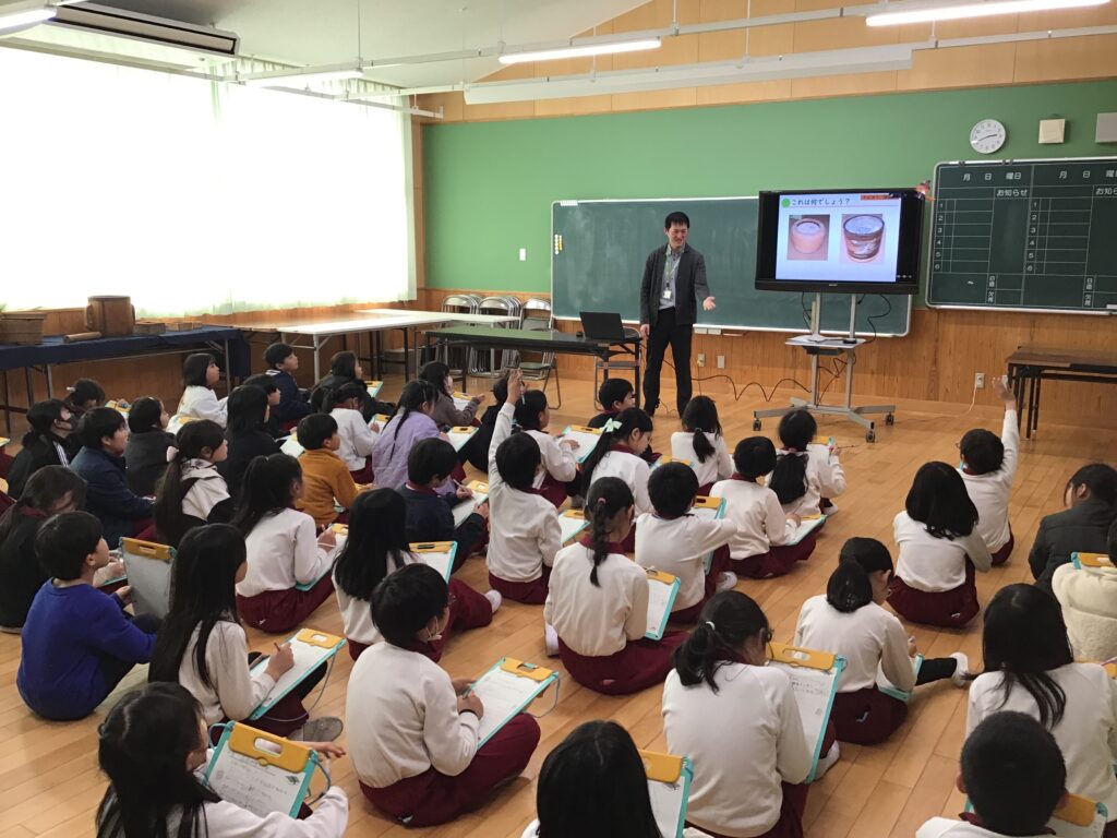 授業では、昆布・煮干し・かつお節の出汁を試飲したり、豆味噌・麦味噌・米味噌の味の違いを比べたりしました。また、かつお節を実際に削る体験も行い、子どもたちは興味津々の様子でした。