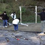 業者の方にダンプカーによる搬入を行ってもらったので、砂場には大きな砂の山ができました。低学年の児童は突然大きなお山ができたので、大喜びです。しかし、授業で幅跳びの練習をする本来の使用には適していません。そこで、高学年児童を中心に、幅跳び用砂場を均して、運動が安全に行えるようメンテナンスを行いました。ここ数日の雨で、少し重みがありましたが、みんなで力を合わせて行いました。手伝ってくれた児童のみなさんありがとうございました。