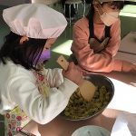 1・2年生が収穫したサツマイモでスイートポテトを作りました。材料は、さつまいも、さとう、バター、生クリーム、たまごです。最初に、洗ったさつまいもを切って、電子レンジでやわらかくしました。次に、やわらかくなったさつまいもの皮をスプーンでむきました。子どもたちは、何回も作業をしているうちに、皮をうまくむくためのスプーンの使い方や向きなどを工夫していきました。そして、友だちと協力してさつまいもをしっかりつぶした後、生クリームとバターを入れてしっかり混ぜました。それから、なめらかになったさつまいもをみんながスプーンですくってラップにのせてひねりながら丸めました。子どもたちは、1つずつとても丁寧に仕上げていきました。ラップを外してカップに入れ、上に卵を塗ってオーブンで焼いたら出来上がりです。校舎内に甘い香りが漂うと、休み時間に気になった高学年が家庭科室にやってくる一幕もありました。お皿にのったおいしそうなスイートポテト。2年生は、1年生に「どれがいい?」「先に選んでいいよ。」と優しく接する姿も見せてくれました。焼きたてのスイートポテトを食べて子どもたちは、「おいしーい。」「また、お家でも作れそうだ。」と、満面の笑みでした。