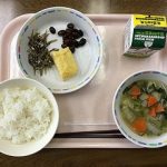 今日の給食は、お正月の行事食「おせち料理」をいくつか取り入れたものでした。日本では昔から新年にいろいろな意味を込めて「おせち料理」を食べる習慣があります。「黒豆」には「黒く日焼けするほどマメに健康で暮らせるように」という健康を願う意味があります。「田作り」には「田をつくる」ということから、「田んぼの豊作」を願う意味があります。卵焼き(だて巻き)にはくるくるとまいて作り、その形が巻物の形をしていることから、「知識が増え、学問ができるように」という意味があります。これらのお話は給食の時に放送委員会から全校に放送されました。今日もおいしく、楽しい給食でした。