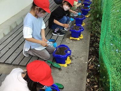 生活科の学習で1年生があさがおの種まきをしました。自分の鉢に土と肥料を入れた後、一粒ずつ丁寧に種をまきました。2年生は、ミニトマトやナスなどの野菜の苗を植えました。子どもたちは、「大きくなあれ」と願いをこめて種まきや苗植えをしていました。その横で3年生は、芽が出たホウセンカやヒマワリの苗の植え替えをしていました。暑くなる時期、これから毎日水やりなどの世話をしながら育てていきます。