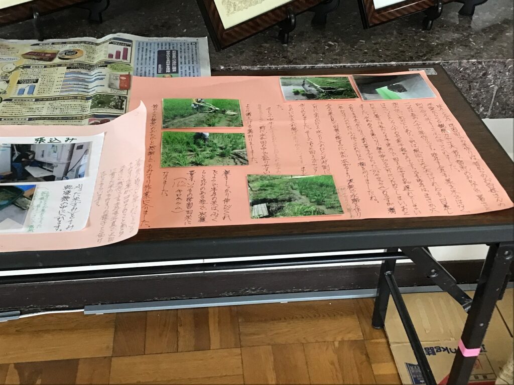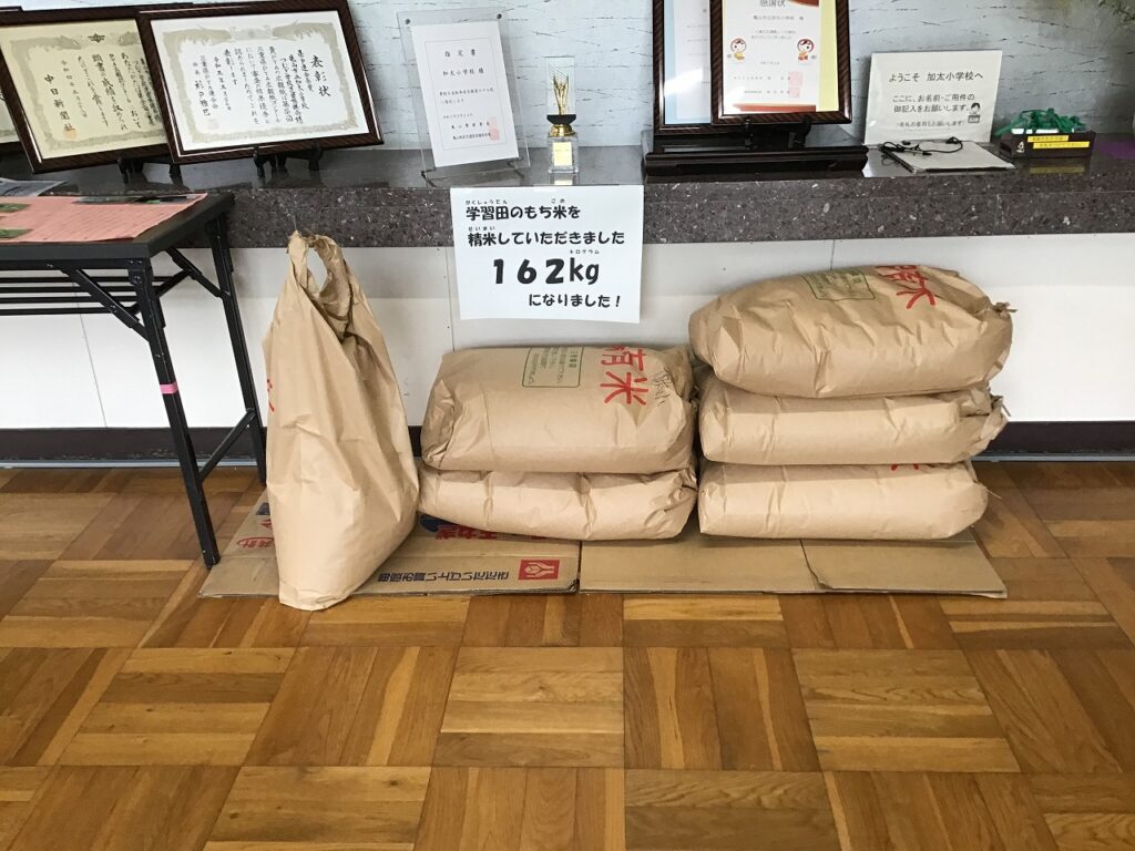 学習田でとれたもち米を地域の方にもみすりしていただきました。今年も昨年同様、暑い夏でしたが、地域の方が田んぼをずっと冷やすことができるように水路を作りかえてくれたり、中干し前に水が田の中で広がりやすいように溝切りをしたりしてくださったおかげで、根がしっかり伸び、たくさん実りました。今年の収穫量は、162㎏です。今後、子どもたちは、このもち米でもちつきをしたり、地域のみなさんに販売したりする予定です。