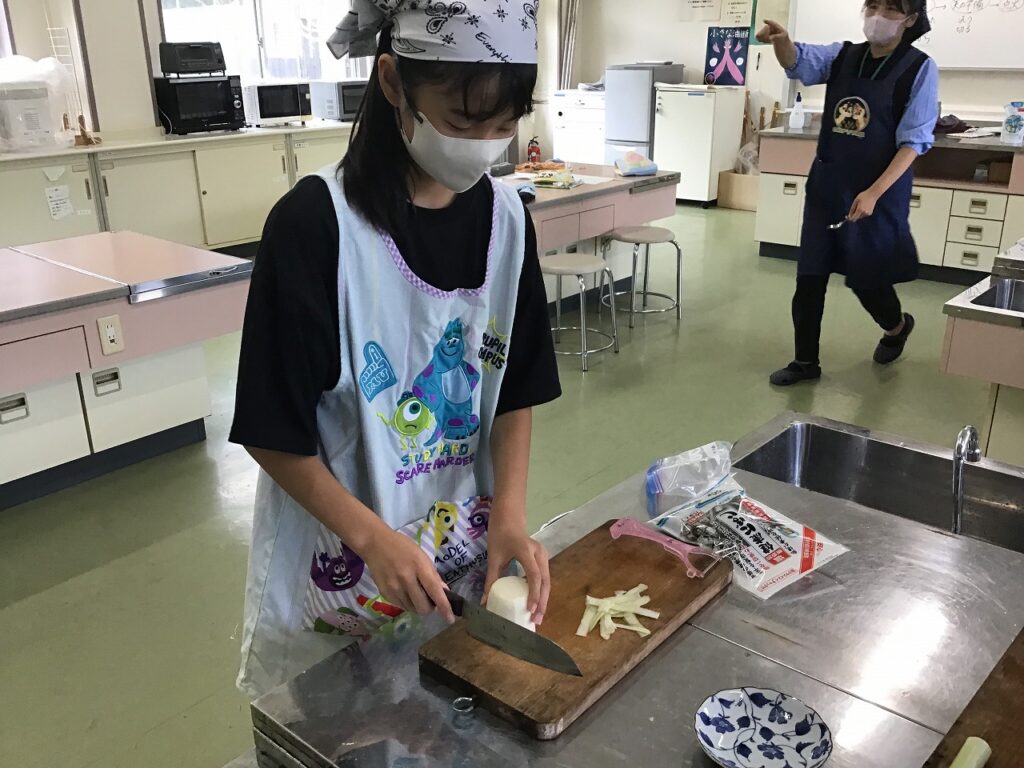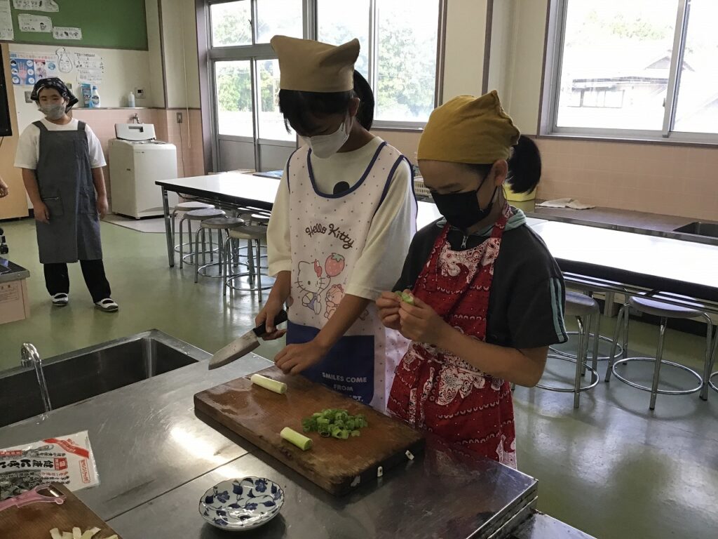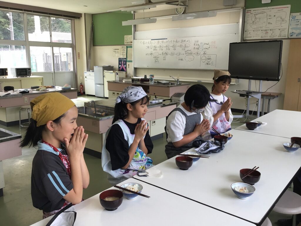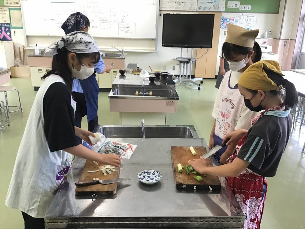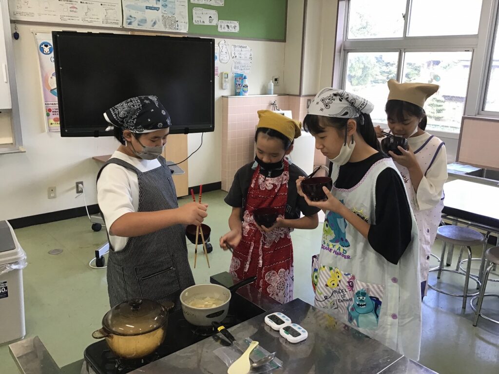5年生が調理実習でご飯とみそ汁を作りました。みそ汁の実は、大根、あげ、ねぎです。ダシは、にぼしからとりました。1回目の調理は、調理の仕方を確認しつつ、先生に教えてもらいながら作りました。少人数なので、時間が余ります。そこで、2回目は、先生のアドバイスなしで、自分たちだけで作りました。2回作ることで、作り方がはっきりとわかった子どもたちは、「これからみそ汁を作るとき、お手伝いができそう」と自信がついた様子でした。