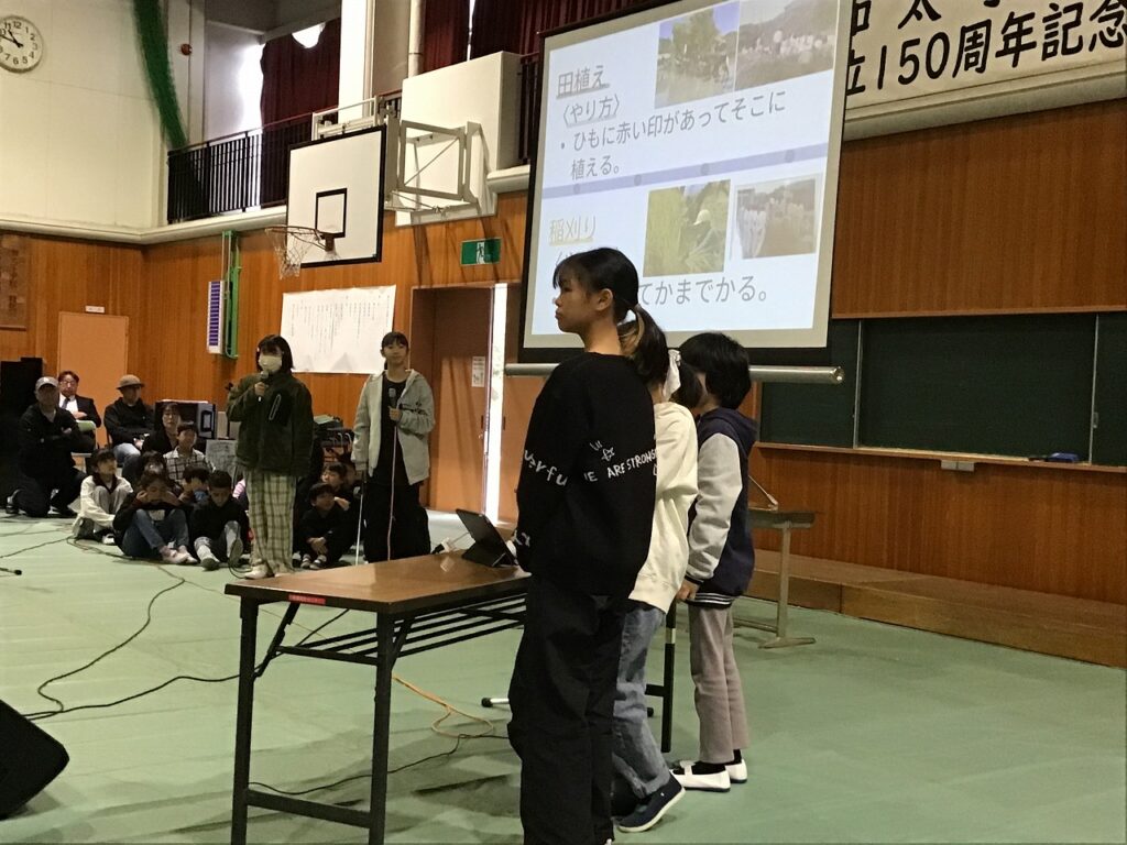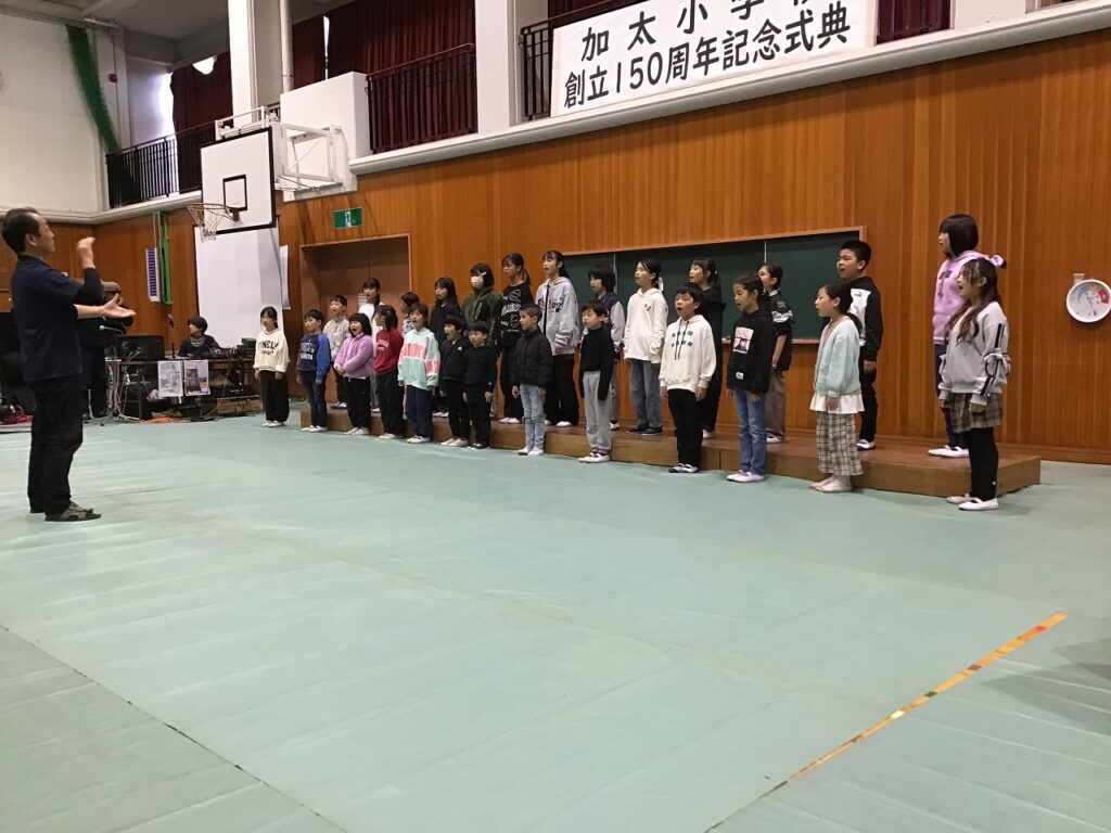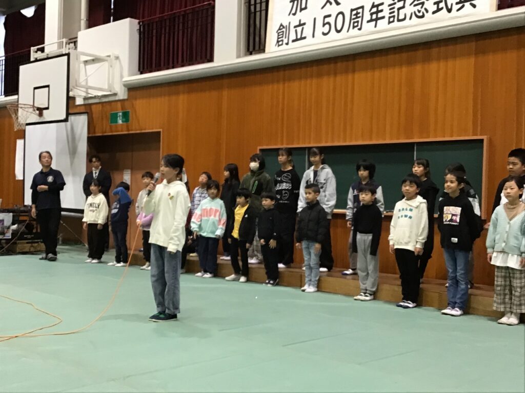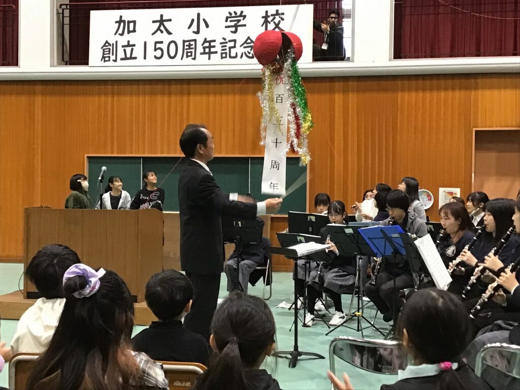 11月9日(日)に加太小学校創立150周年記念式典が、「地域の学び舎 輝く未来へ」をテーマに行われました。関中学校吹奏楽部とウインドアンサンブル関の合同バンドによるファンファーレに合わせて5年生がくす玉を割ってスタート。来賓の方々に温かいお言葉をいただいた後、記念イベントが行われました。記念イベントでは、和太鼓&トランペットの演奏やよさこい塾・ありがた屋による演舞、映像で振り返る思い出、吹奏楽の演奏が行われました。子どもたちは、地域の方に聞き取りをした昔の小学校の様子を今と比べまとめたものを全児童がテーマ別に発表しました。また、11月6日に音楽会で歌った歌「大切なもの」の合唱もしました。最後に、会場の全員で吹奏楽の演奏に合わせて「ふるさと」を合唱しました。多くの方が集い、心温まる盛大な記念式典となりました。午後からは、町づくり協議会による秋まつりが行われ、ゲームや抽選会を楽しみました。また、さつまいもやもち米の販売、今年実ったぎんなんのつかみどり販売をして子どもたちは、楽しい1日を過ごしました。