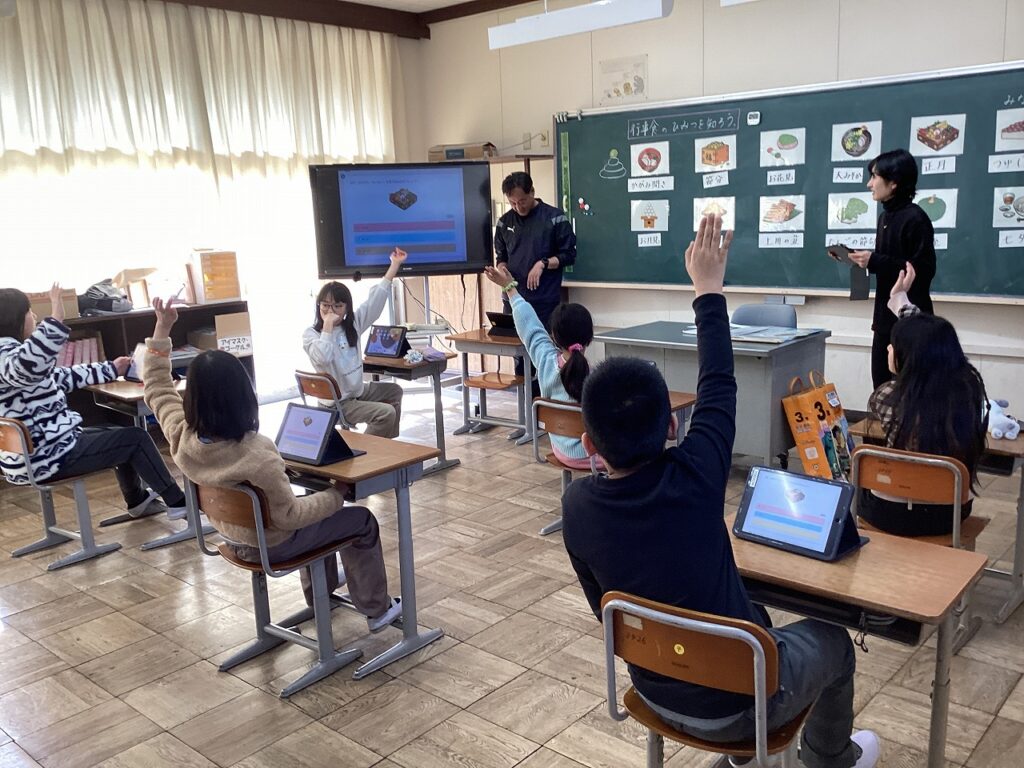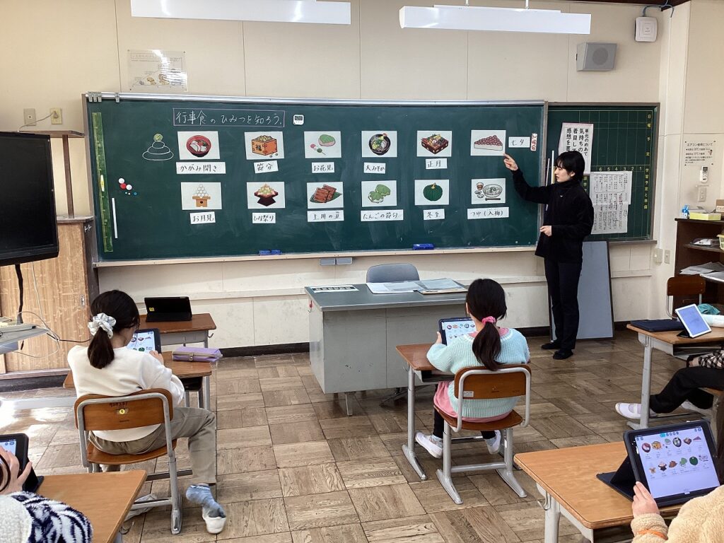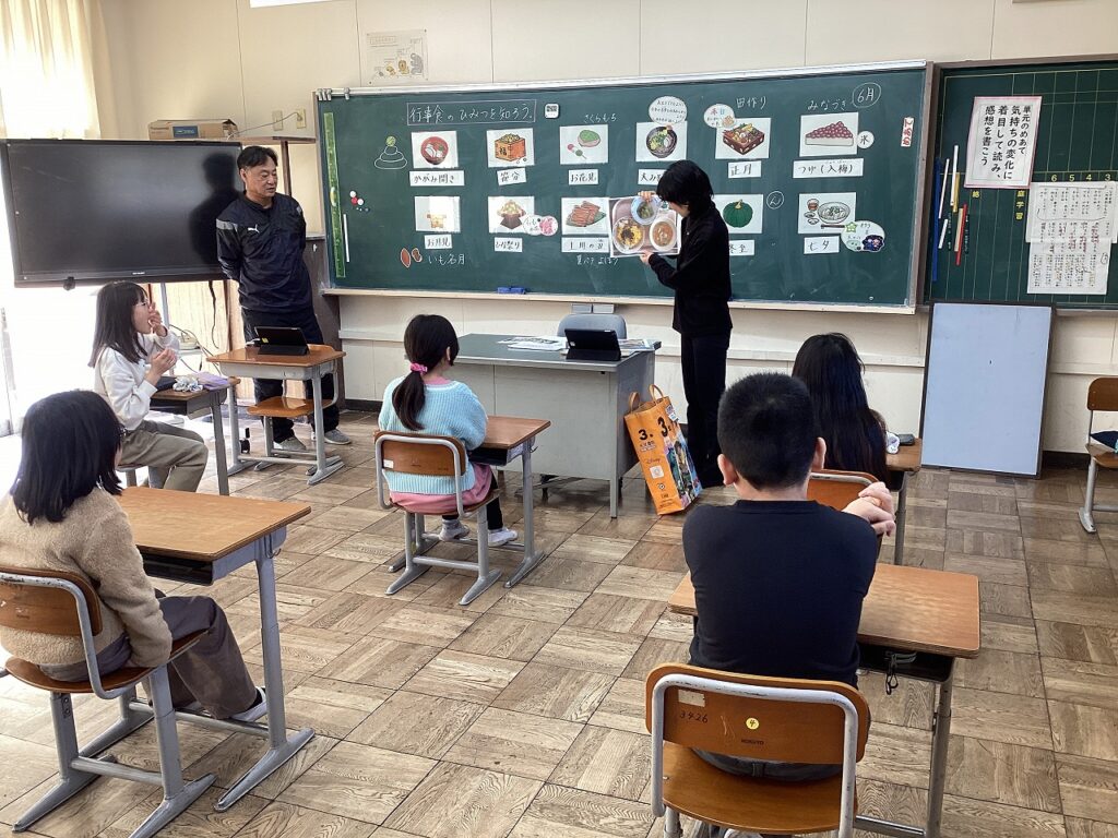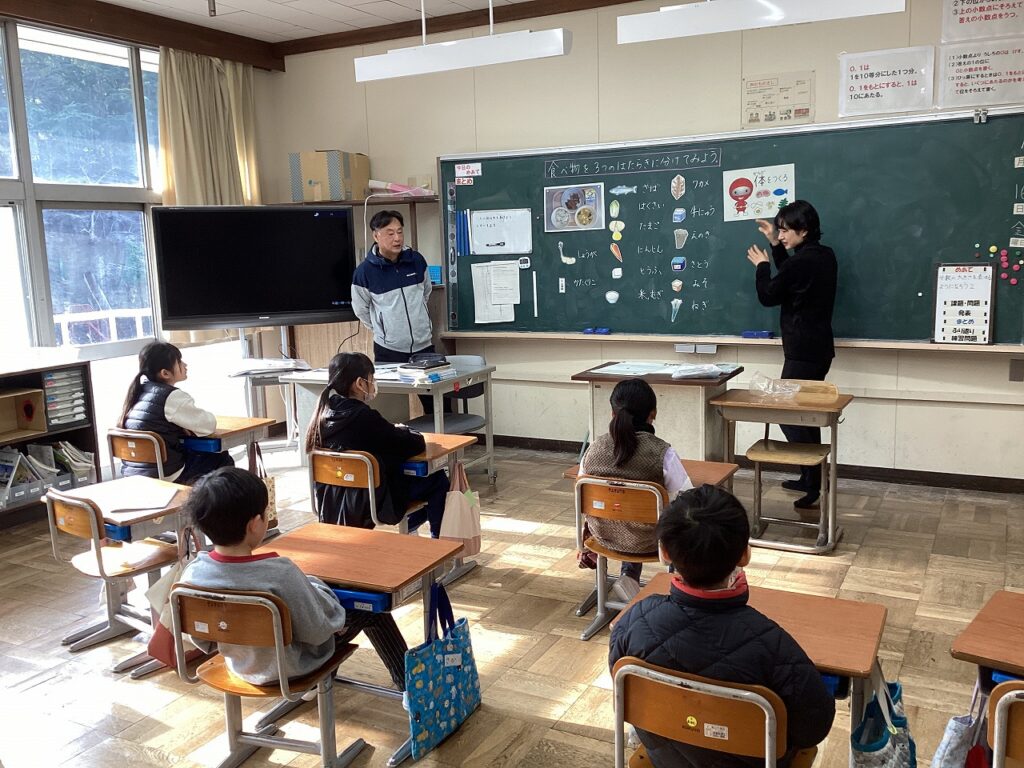 先日、栄養教諭の先生が3・4年生に食育の授業を行いました。3年生は、「食べ物を3つの働きに分けてみよう」です。食べ物を「赤・緑・黄」の3つの仲間に分けながらそれぞれの働きについて学習しました。4年生は、「行事食のひみつを知ろう」です。鏡開きや節分などにちなんだ食事やそれにこめられた願いなどについて学習しました。普段から知っているようで知らないこともあり、みんな興味をもって話を聞いていました。