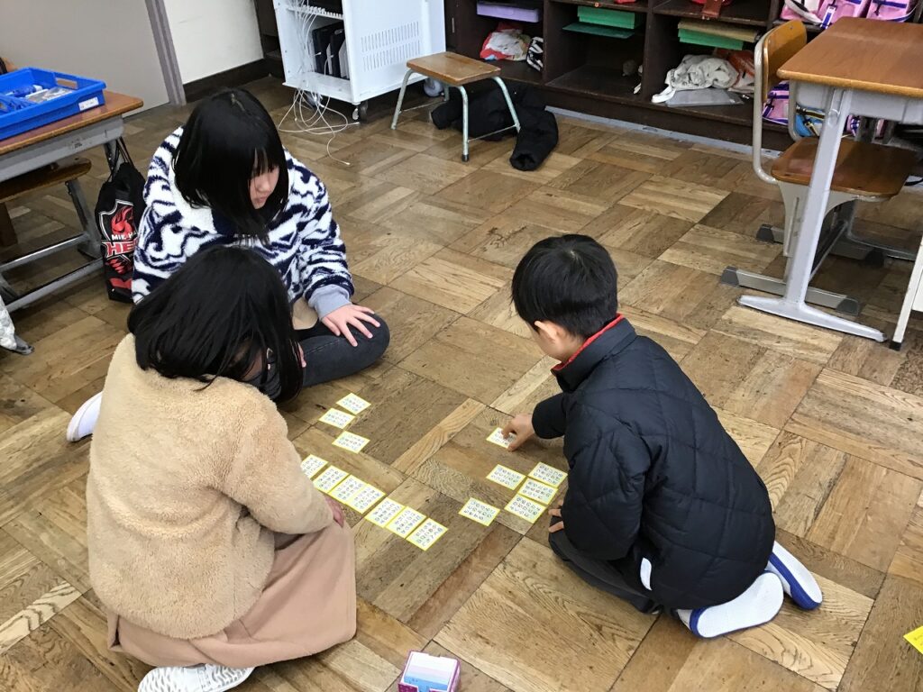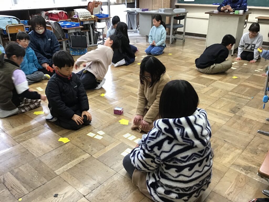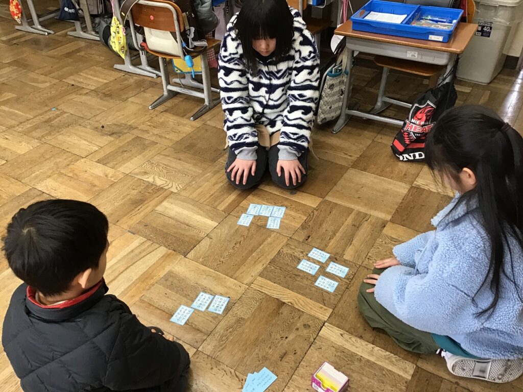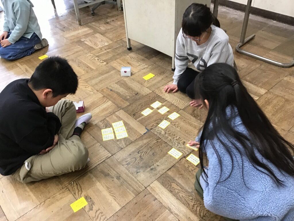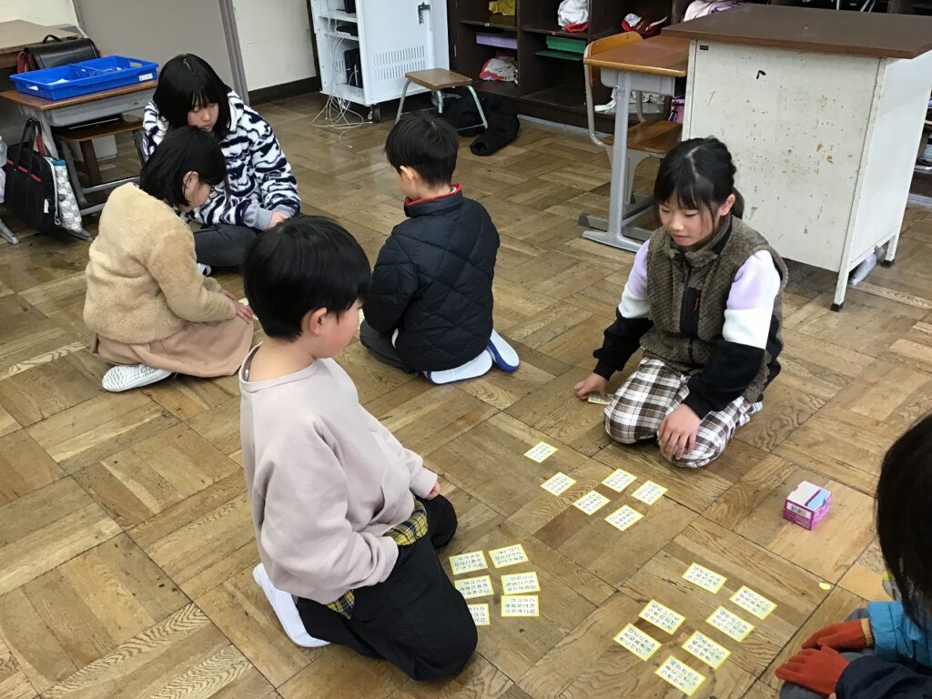 今日は、3・4年生が五色百人一首の水色と黄色の札で百人一首の練習をしていました。自分の切り札をとろうと頑張っている子、集中して目の前に置かれた札を覚えている子など、それぞれに目的意識をもって取り組んでいました。2月18日に行われる百人一首大会に向けてこれからも頑張ります。
