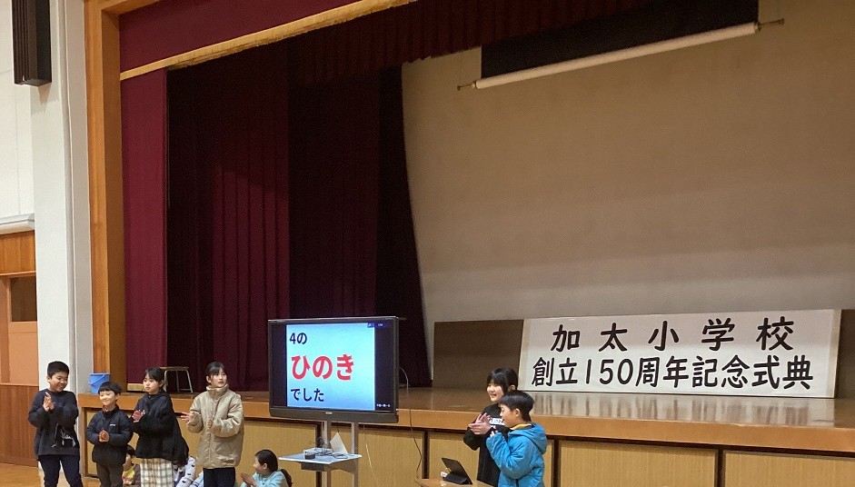 今日、関小学校の3年生に加太小へ来てもらい、体育館で交流会を行いました。交流会では、関小学校のみなさんが、関宿についての発表をしてくれました。加太小からは、加太小の昔と今について調べたことを発表しました。その後、みんなで王様ドッジをして楽しみました。子どもたちは、「関宿について詳しくわかった」「みんなで遊んで楽しかった」と、楽しい時間を過ごした様子でした。