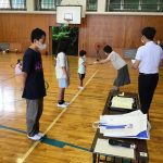 今日は、たてわり班掃除の日です。たてわり班のメンバーで分担し、廊下や階段、特別教室、トイレ、児童玄関の掃除を行います。人数が少ないので、特別教室も2人で行わなければなりません。子どもたちは、高学年と低学年がペアになり、力を合わせてすみずみまで掃除をがんばりました。異学年で一緒に掃除をすることで、低学年は高学年から掃除のしかたを学び、高学年は、低学年のリーダーとしての役割を果たしていきます。