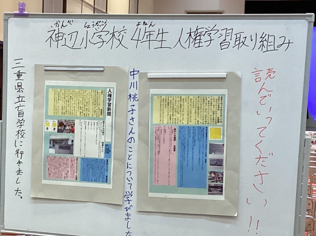 12月6日(土)亀山市文化会館中央コミュニティセンターを会場にして「ヒューマンフェスタIN亀山」が開催されました。「ヒューマンフェスタ」は市民の方々が人権についてともに考えていこうと毎年開催されている催しです。午前中の市民団体ブースには神辺小学校の4年生が参加し、4月から取り組んでいる人権学習の内容を「桃子さん新聞」としてまとめ、会場内に掲示しました。人権を大切にした街づくりについて、子どもたちから多くの方々に発信できたことは大変意義あることだと思います。