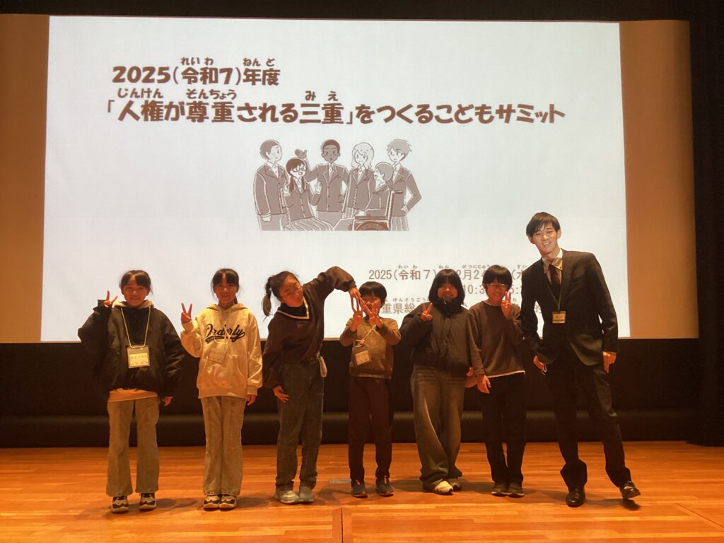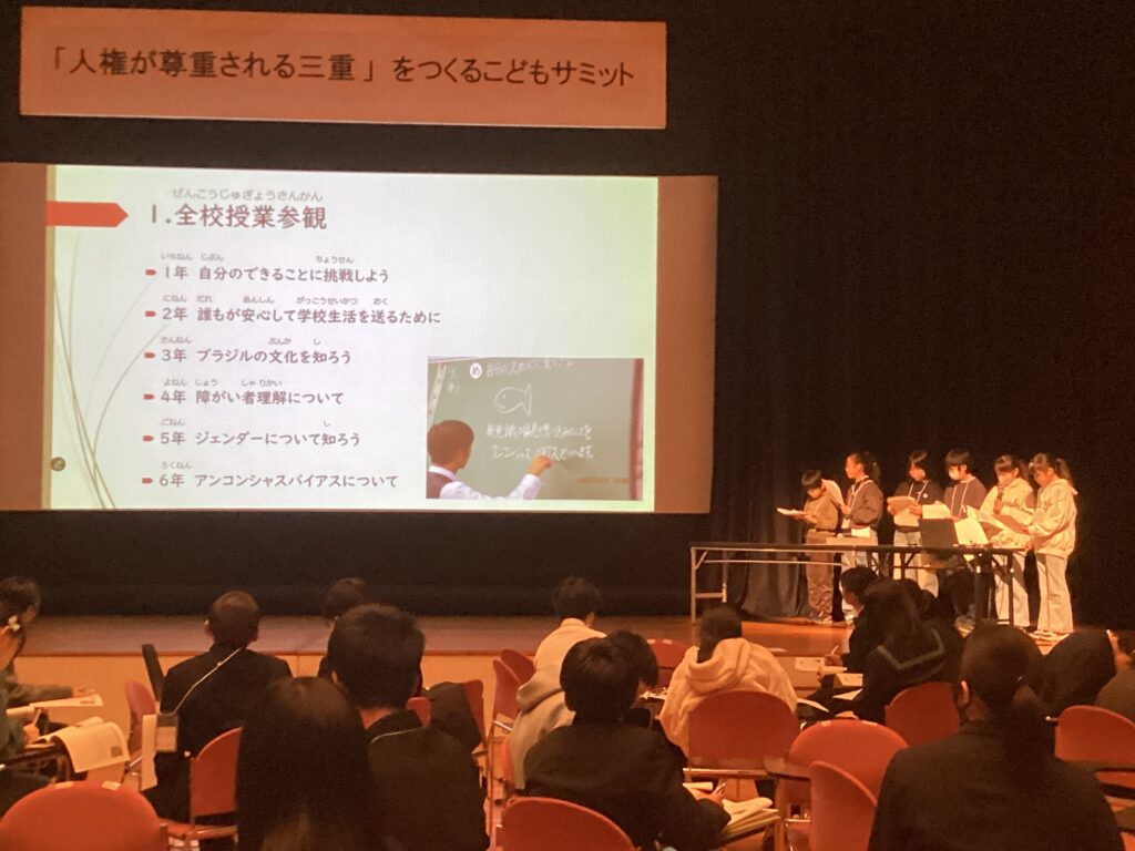 12月24日(水)に三重県総合文化センターで『「人権が尊重される三重」をつくる こどもサミット』が開催されました。県内の小中高等学校・特別支援学校10校が集まり、各学校で取り組んでいる人権学習についての報告と意見交換を行いました。神辺小学校からは、4年生から6年生までの代表7名が参加し、差別のない安心して過ごせる社会の実現にむけて自分たちにできること等を交流しました。
