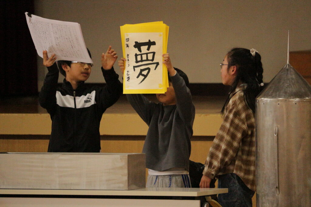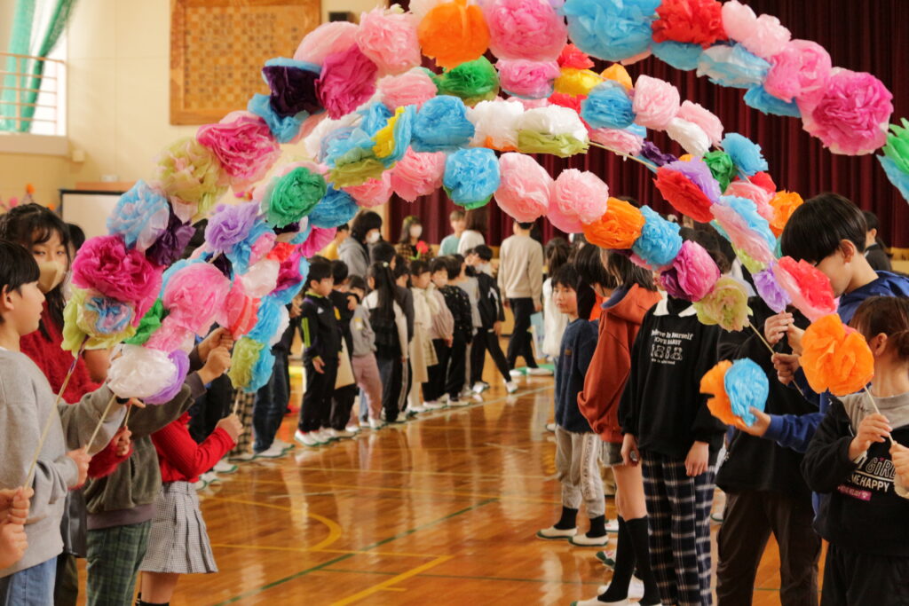 タイムカプセル封入式の後、「6年生を送る会」を開催しました。1年生は楽器クイズと演奏、2年生は6年生と一緒にソーラン演舞、3年生はクイズとダンスと劇、4年生は手話による合唱とダンス、5年生もクイズと合唱を披露して6年生の卒業をお祝いしました。在校生からは心のこもった手作りのプレゼントが渡されました。また、地域の方からはハンドベルの演奏をプレゼントしていただきました。最後に、お世話になった先生方からのメッセージ動画がありました。6年生への「ありがとう」の気持ちがあふれる3時間でした。