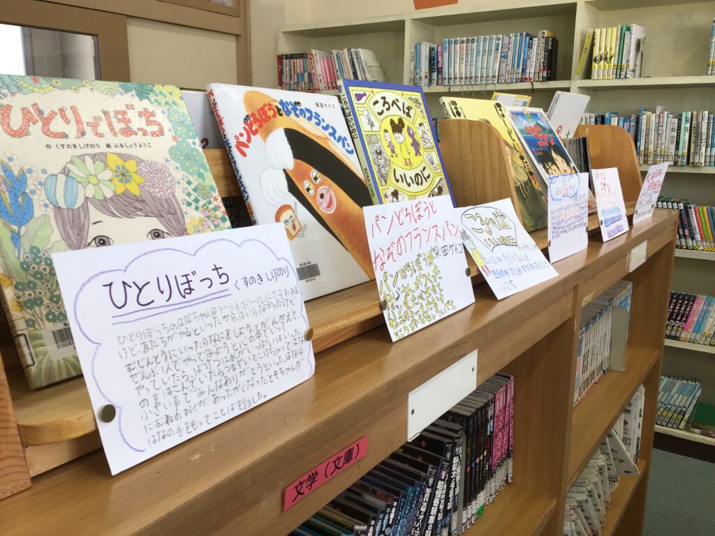 本を読むことが好きな子が増えてきています。図書館の中には、本を読みたくなるような工夫がたくさんあります。その一つにポップがあります。写真は、3年生の子どもたちが作ってくれたポップです。その本の魅力を十分に文とイラストで表現しています。どんどん本を読むことが好きになってほしいと思います。