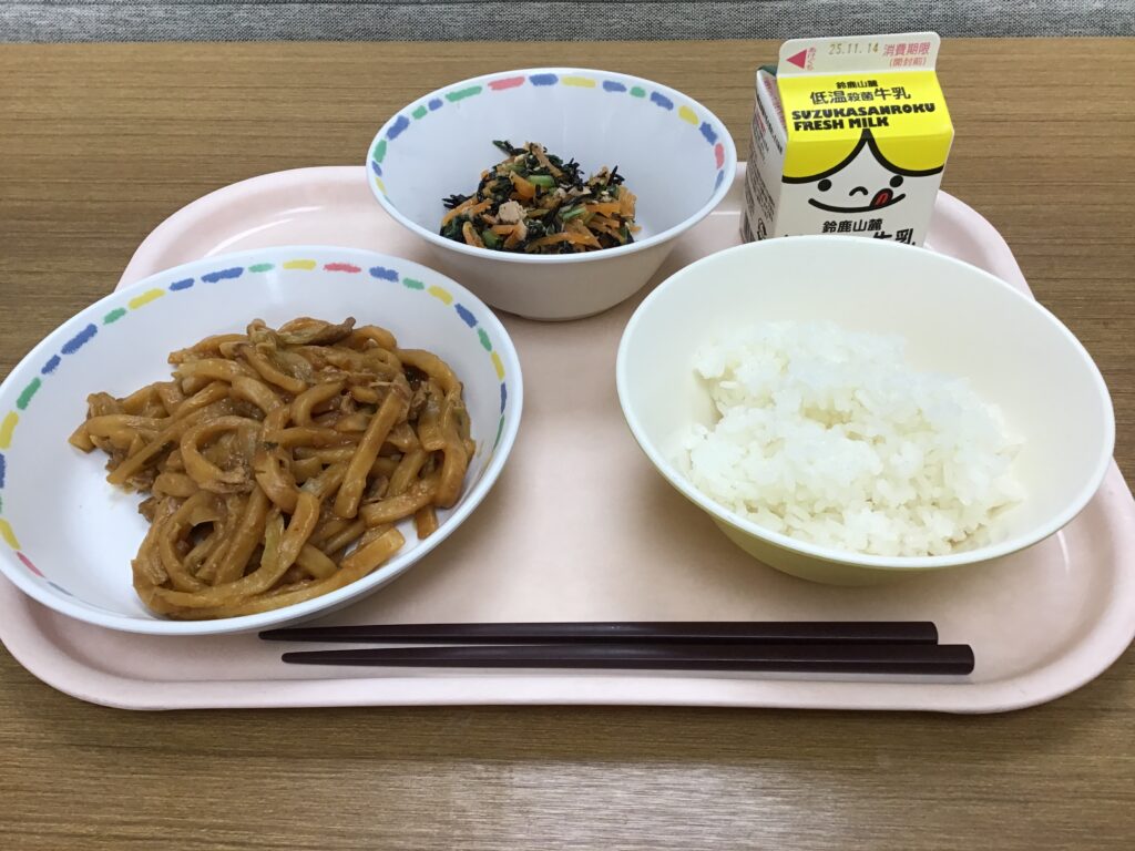 この日の献立は、ご飯、味噌焼きうどん、小松菜とひじきとツナの和えものでした。子どもたちが大好きな味噌焼きうどんは、タレもレシピも、「亀山味噌焼きうどん」を参考にしています。タレは、赤味噌、砂糖、みりん、しょうゆ等と、一味唐辛子が入っています。子どもたちは、うれしそうに、美味しそうに給食を食べていました。