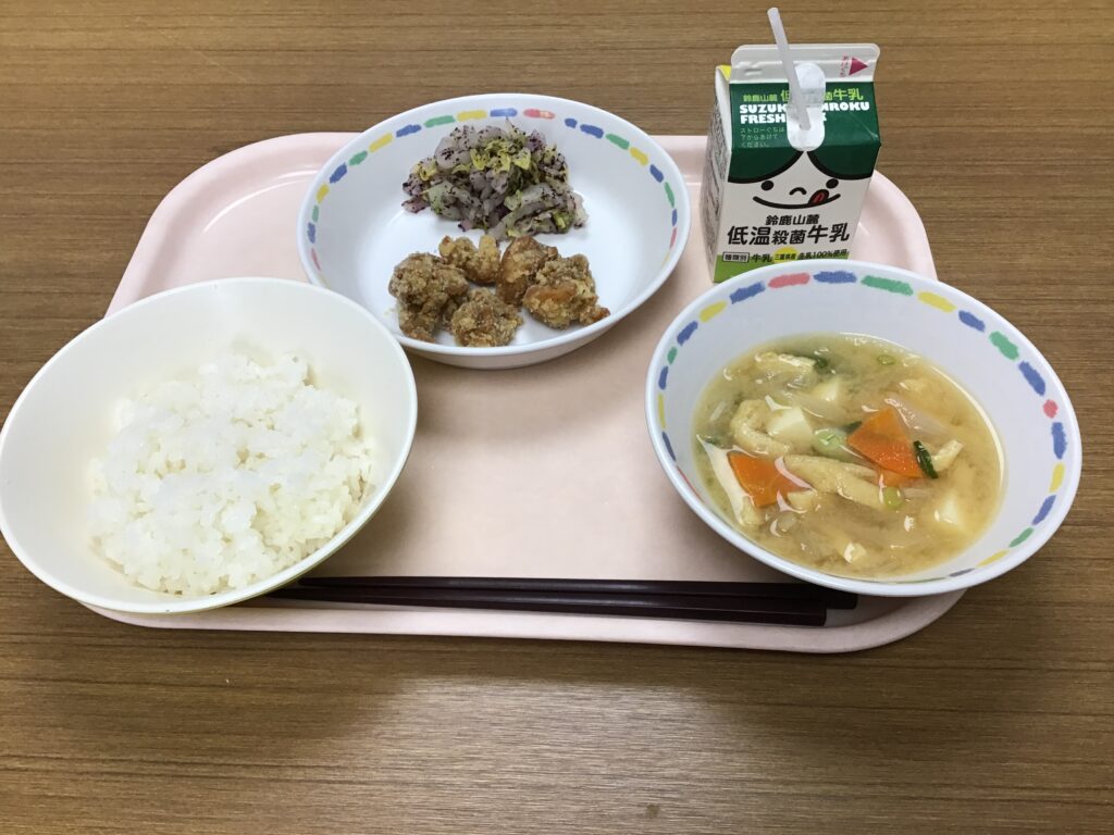 1月24日~30日は、全国学校給食週間です。この一週間は、学校給食の歴史をふり返り、学校給食の意義や役割について理解と関心を深める期間です。亀山市では毎年、この期間中に各校のリクエストに応えています。亀山南小学校は、牛乳、ご飯、白みそ汁、白菜のしそ和え、鶏肉のから揚げ(カレー風味)です。