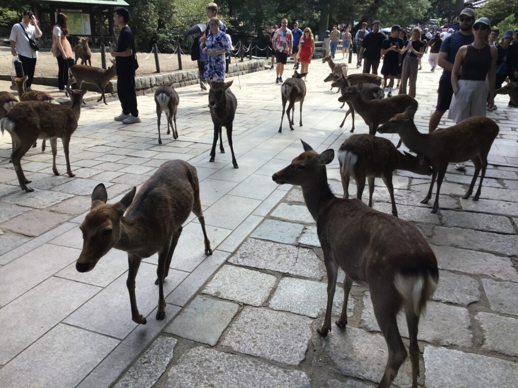 一日目は、法隆寺、東大寺・奈良公園、清水寺を見学しました。当日は、暑いくらいの良い天気でした。子どもたちは、先生やバスガイドさんのお話や説明をしっかりと聴いて、これまでの学習内容を深め、しおりに書き込んでいました。また、見学地では、二列に並んで移動したり、集合時間を守ったりして規律正しい集団行動をすることができました。