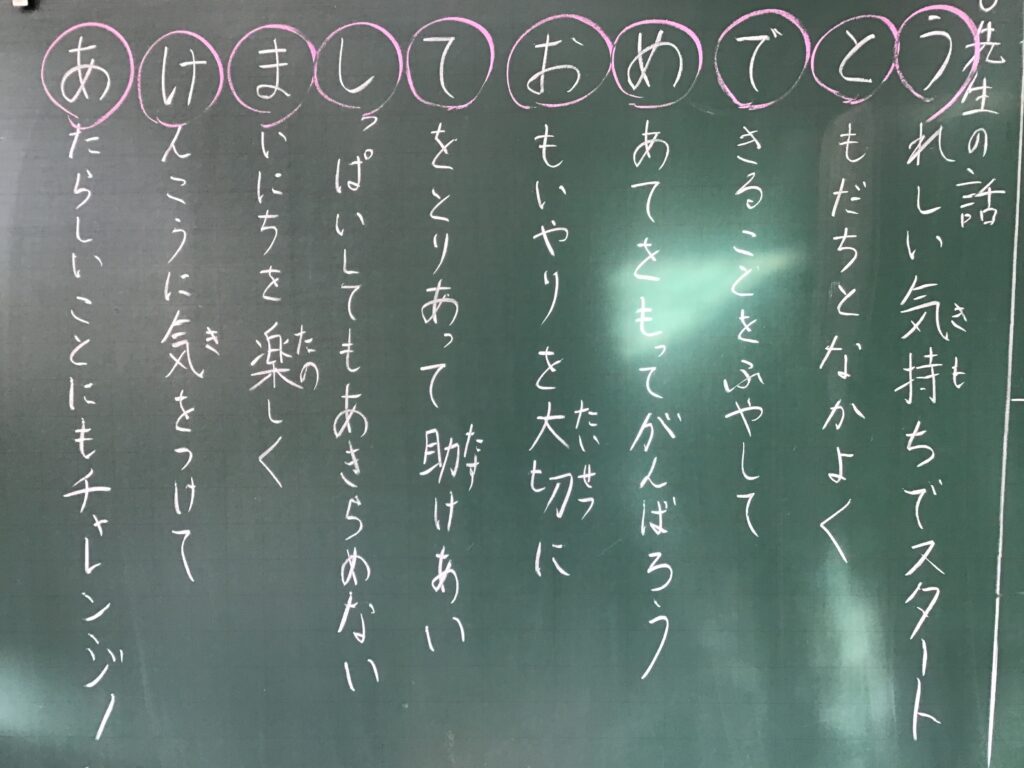 保護者の皆様ならびに地域の皆様、本年もよろしくお願いいたします。挨拶がとても明るかったことや、教室で落ち着いて担任の話を聴いている様子から、子どもたちの「3学期も、目標に向かって頑張ろう」という気持ちが伝わってきました。冬休み中も、ご家庭や地域で楽しく充実した日々を過ごすことができたおかげです。ありがとうございます。(板書:3年生教室)