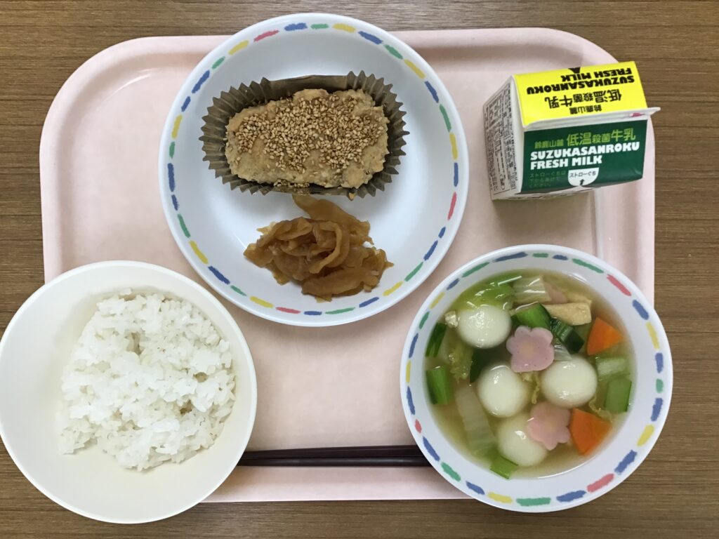 3学期最初の給食の献立は、お正月料理で、牛乳、麦ごはん、松風焼き、つぼ漬け、雑煮でした。松風焼きは、表に胡麻が載っていて、裏には何も無いので、「隠し事なく、正直に生きられますように。」という願いが込められています。学校給食は、食べ物の栄養や旬、いろいろな料理、お正月・節分・ひな祭り等の日本に昔からある行事等について知ってほしいと思い、献立が考えられています。3学期の給食も楽しみです。