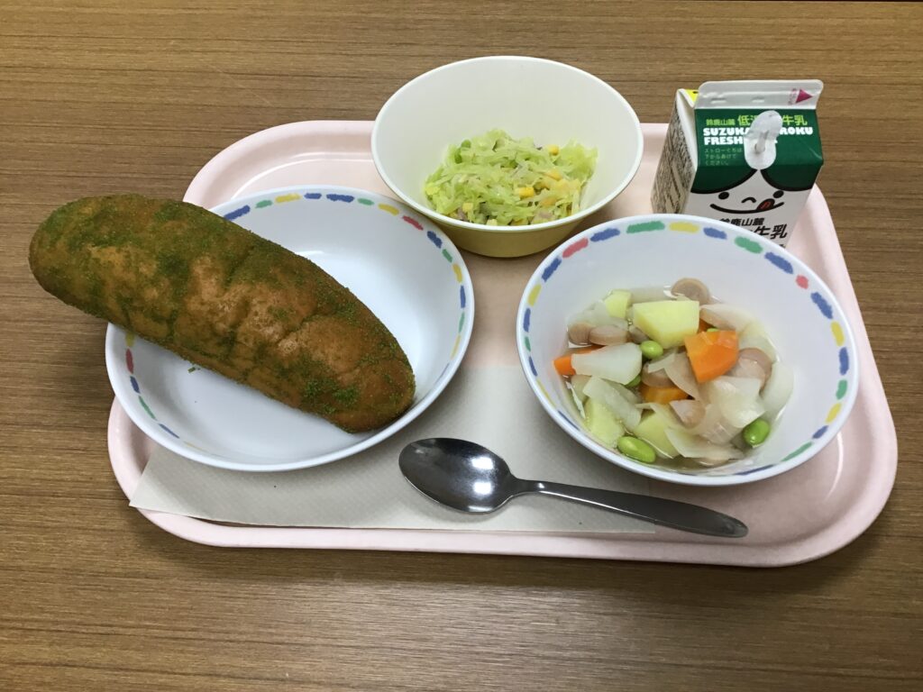 全国学校給食週間の2日目の献立は、牛乳、亀山茶揚あげパン(ロールパン)、ポトフ、キャベツソテーです。お茶、大根、人参は、亀山市で採れた食材です。亀山市では、この日のように地産地消を行っている献立を「かめやまっ子給食」と名付けています。学校給食は、子どもたちの健全な発達を支えることはもちろん、環境にも優しいことを学ぶことができます。
