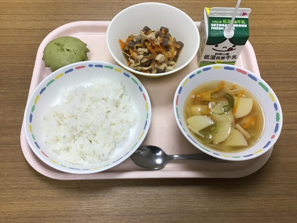 全国学校給食週間3日目の献立は、牛乳、麦ごはん、味ご飯、すまし汁、亀山茶ケーキでした。この日も、「かめやまっ子給食」として、亀山市で採れた人参とねぎ、お茶を食材として使用しています。今日の人参は、向陽二号という品種です。向陽二号は、病気に強く、どんな土でも育ちやすいそうです。また、人参特有の臭いは無く、食べやすいことから日本で最も多く作られているそうです。