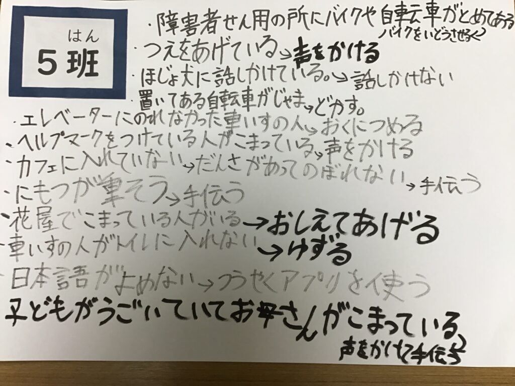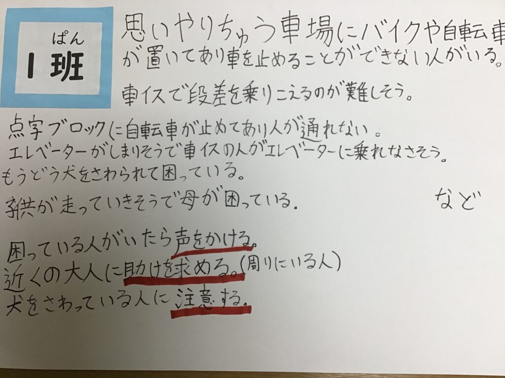 人権を尊重することの大切さについて理解を深めることや、人の思いを聴いたり協力したりする活動を通して、人とのつながりを大切にする態度を養うこと目的として、人権集会が開かれました。各なかよし班で、教材をもとに、困っている人に気づき、自分ができる行動について考え、話し合いました。各班で話し合った内容は、まとめて掲示します。