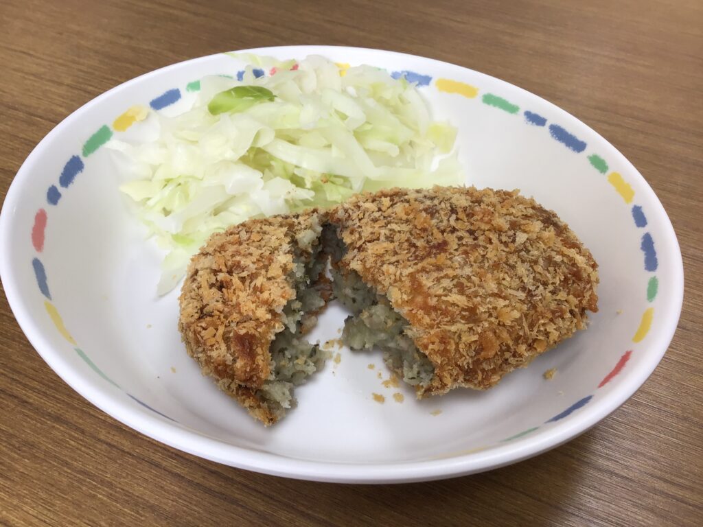 亀山コロッケは、豚肉と玉ねぎを油でいため、赤ワインを振り、塩コショウで味つけし、お茶の葉を入れます。亀山コロッケは、豚ひき肉とお茶の葉が亀山産であるのが特徴です。次に、ジャガイモを蒸して、よくつぶします。そして、つぶしたジャガイモと中の具を混ぜ合わせ、丸めて、小麦粉やパン粉の衣をつけて、油で揚げて出来上がりです。一つ一つが調理員さんの手作りです。子どもたちは、感謝しながら味わって食べていました。