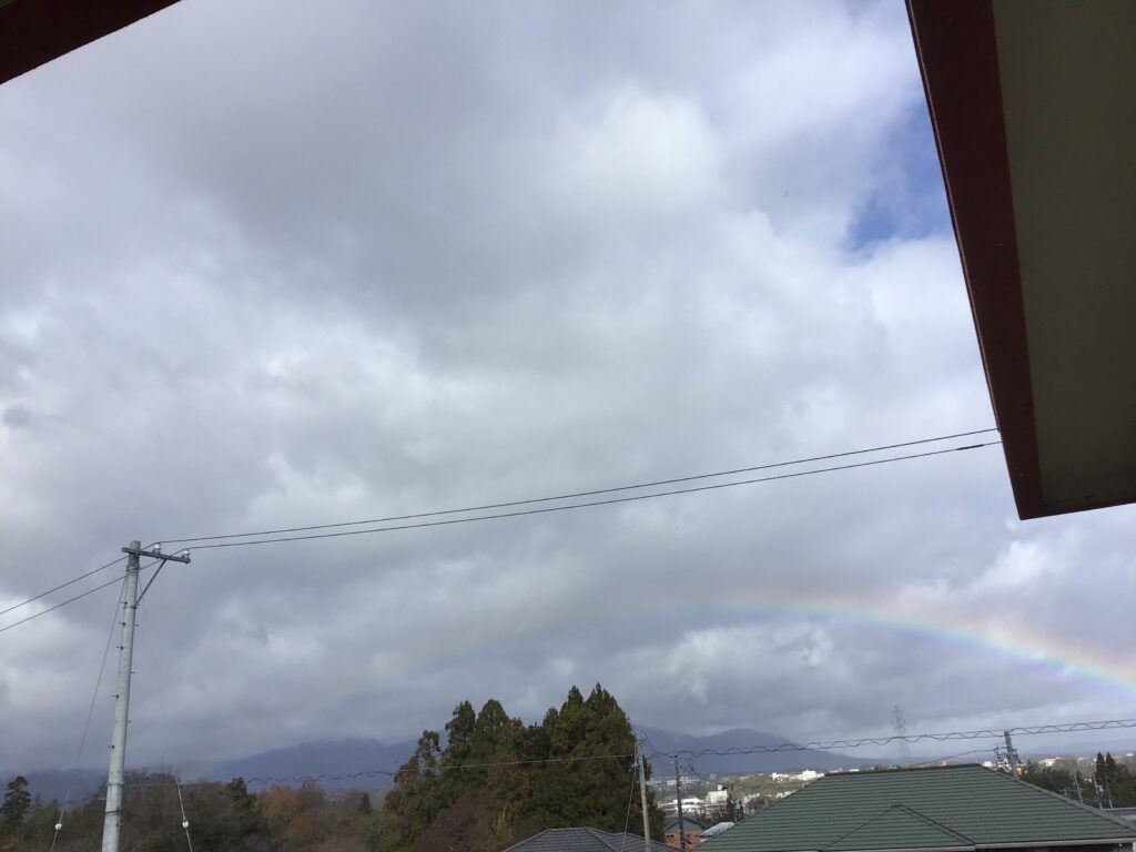当日の朝は、とても冷えていて、小雨も降っていました。さぞかし子どもたちは、寒がって登校してくるだろうと、亀山南小の交差点で子どもたちを待ちました。ところが、子どもたちは、うれしそうに笑顔で登校してきました。ある子が、その理由を教えてくれました。「虹がかかっているよ。虹の上を歩いてみたいなあ。」心が、ぽかぽかと温かくなりました。