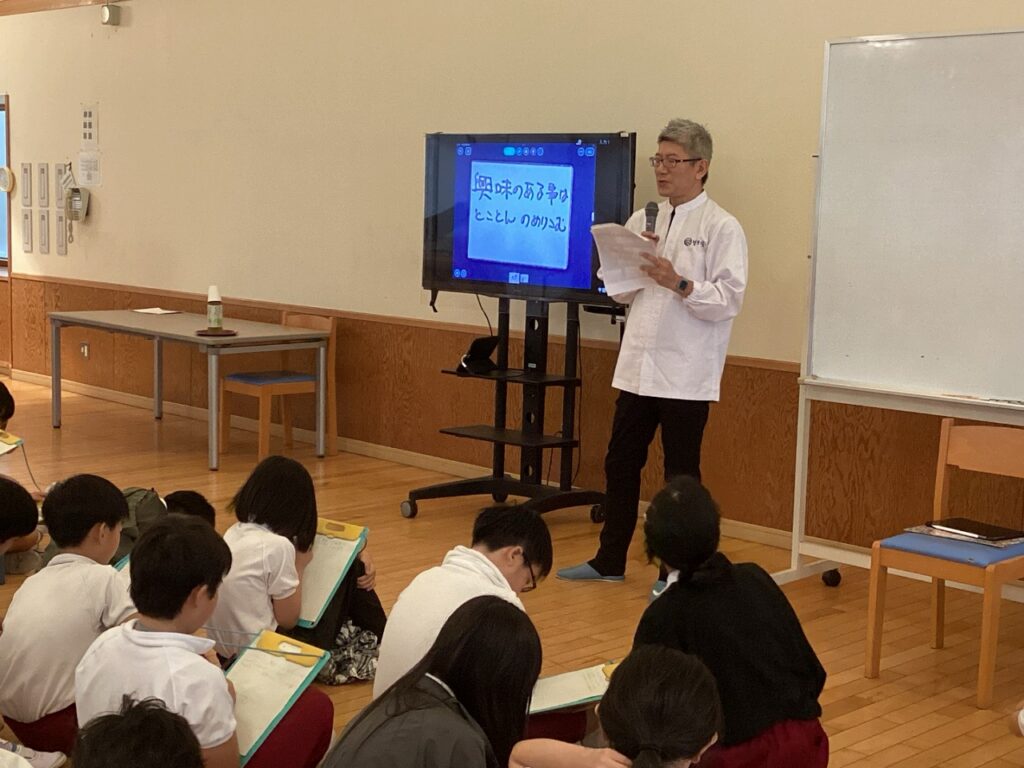 第1回は、生甘堂の伊藤さんから、和菓子職人への道、職業人としての思いなどを熱く語っていただきました。これからの未来を拓く子どもたちへの願いも語っていただきました。子どもたちも、自分の思いと重ねながら、話を聴いているようでした。