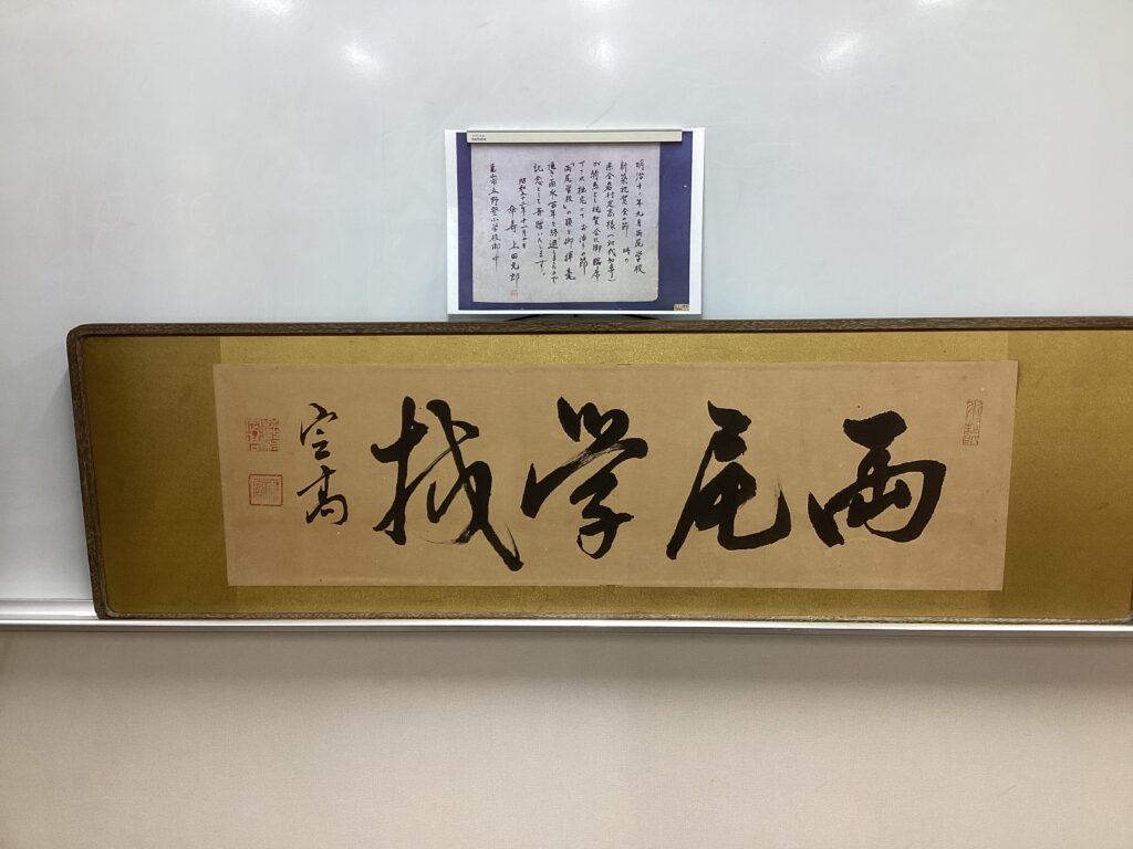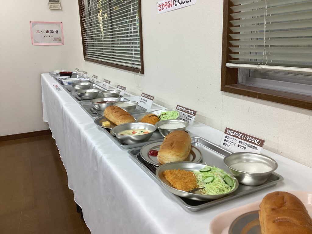 展示物:昔の集合写真、卒業アルバム、校舎の模型、資料等