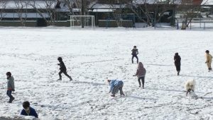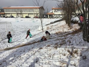 子どもたちは、クラスのみんなで雪遊び。雪合戦、雪の上での鬼ごっこ、雪だるまづくり、かまくらづくり・・・。そして、スーパーの袋の上にのって土手をそりすべり。みんな元気いっぱい。雪を楽しみました。