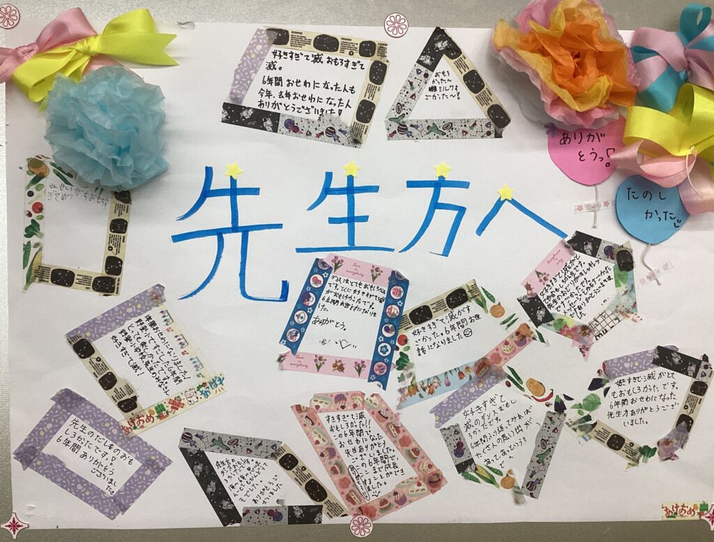 6年生の皆さん、今までの野登小学校を引っ張ってくれて、ありがとうございました。そんな皆さんのことが1~5年生のみんなも先生たちも大好きです!卒業まで残りわずかとなりました。今日感じた感謝の気持ち、そしてこの野登小学校でのたくさんの思い出を胸に、残りの一日一日を大切に過ごしてください。