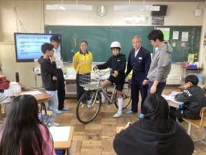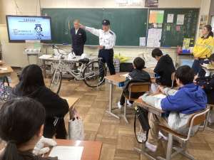 2月24日、4月から中学生になる6年生を対象に「自転車交通安全教室」を開催しました。亀山署川崎駐在所と野登駐在所様にお世話になり、亀山地区交通安全協会のご協力のもと、交通ルールを守り安全で正しい自転車の乗り方について、教えていただきました。自転車通学に慣れない1学期は、事故が多くなる傾向があるそうです。中学校への通学路で、特に気を付けて走行した方が良い場所も教えていただきました。中学校入学までに、①新しい自転車に慣れる練習を何度もする、②通学路を確認しておくよう、お話していただきました。交通ルールをしっかりと守り、安全に通学してほしいと願っています。