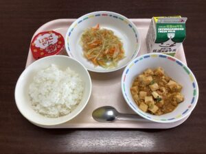 今日から、今年度の給食が始まりました。初回のメニューは、ご飯・牛乳・麻婆豆腐・パンサンスー・お祝いいちごゼリーでした。