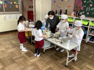 給食は、「適切な栄養摂取による健康増進に加え、正しい食の知識を身に着け、望ましい食習慣を養う」ことを目標としています。成長段階における子どもたちにとって、「食事・食習慣」はとても大切だと思います。楽しく、安全に、そして健康に良い食事のとり方などについて学ぶ時間としていきます。