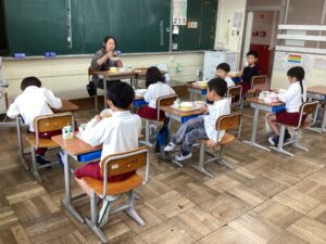 1年生にとっては、小学校生活初めての給食です。準備にも少し時間がかかるため、しばらくの間は4時間目の途中から、準備を始めます。