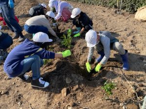 子どもたちは、二人一組になって土を掘り、苗木を支えながら根に土を被せました。コツをつかむと、植えるスピードも上がりつつ、しっかり育つよう心を込めて植えました。体験をさせていただいた伊達製茶の伊達さんをはじめ、地域の農家さんにもお手伝いいただきながら、気持ちの良い春空の下、素敵な体験ができました。お茶の葉が収穫できるのは数年後。これからの生長が楽しみです。植樹後は、工場を見学させていただき、興味津々の子どもたちでした。伊達さん、地域のみなさん、ありがとうございました。