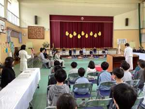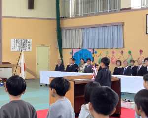 令和8年度の入学式が挙行され、新1年生9名が入学しました。全校児童数は54名です。入学式には全校児童が参列し、来賓の皆様をはじめ、保護者の皆様、教職員、そして全在校生が出席し、温かな雰囲気の中で執り行われました。新1年生一人ひとりが、自分の名前を呼ばれると大きな声で返事をし、その姿を見守る会場全体に、やさしく和やかな空気が広がっていました。