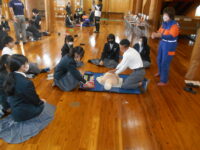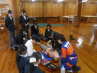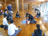 2生対象に、亀山消防本部と消防団の皆さんに救命救急講座をしていただきました。AEDの使い方や胸骨圧迫の仕方などを教えていただきました。一生懸命取り組む生徒の姿や話をしっかり聞く姿勢などをほめていただきました。