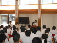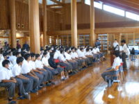 後期生徒会の役員選挙のために立会演説会を行いました。立候補者は、より良い学校、楽しい学校にするための公約を全校生徒の前で演説しました。すべての立候補者が堂々としてはっきりと自分の考えを述べていました。話を聞いている生徒も真剣でした。