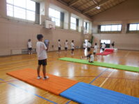 1年生は体育の時間にマット運動を行っています。今日は、前転、後転、側転、個人技などを練習していました。何度も何度も繰り返し技の練習をしていました。